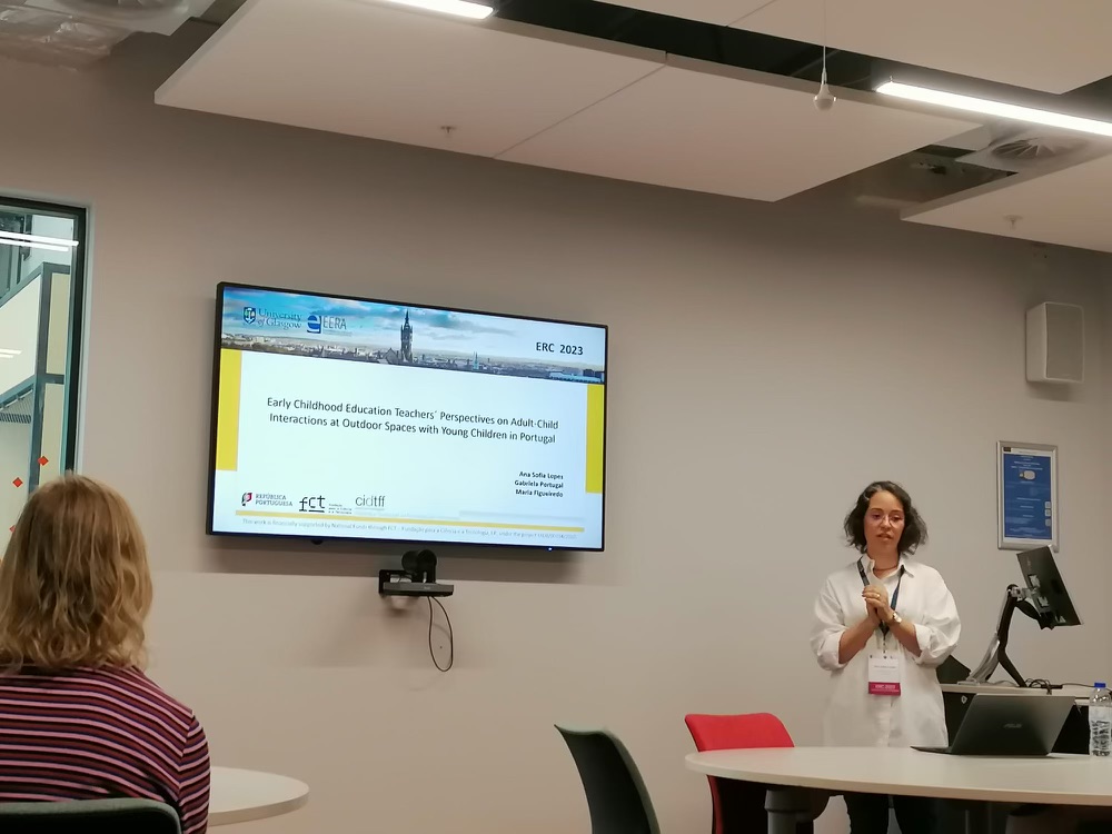 22 agosto | 99 ERC SES 08 P: Early Childhood and Education | “Early Childhood Education Teachers’ Perspectives on Adult-Child Interactions at Outdoor Spaces with Young children in Portugal”, por Ana Sofia Lopes (apresentadora; CIDTFF, DEP, UA), Gabriela Portugal (CIDTFF, DEP, UA) e Maria Figueiredo (Instituto Politécnico de Viseu)