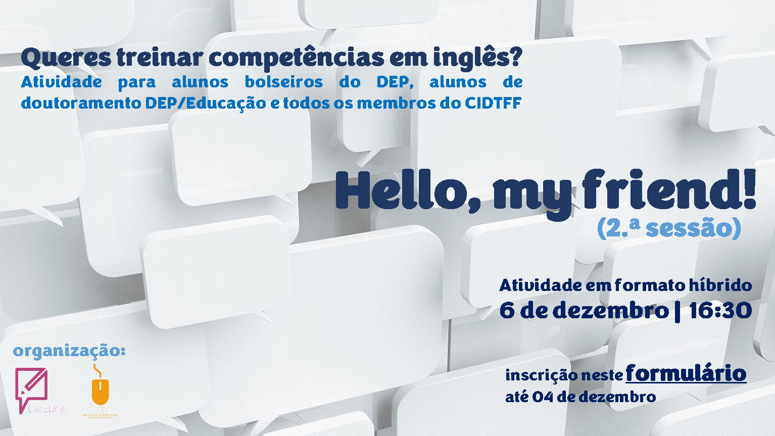 O Laboratório de Conteúdos Digitais (LCD) e o Laboratório de Educação em Línguas (LabELing) do CIDTFF vão dinamizar a segunda sessão da atividade “Hello, my friend”, em formato híbrido, com vista ao desenvolvimento de competências linguísticas e estratégicas em língua inglesa, em contexto académico.