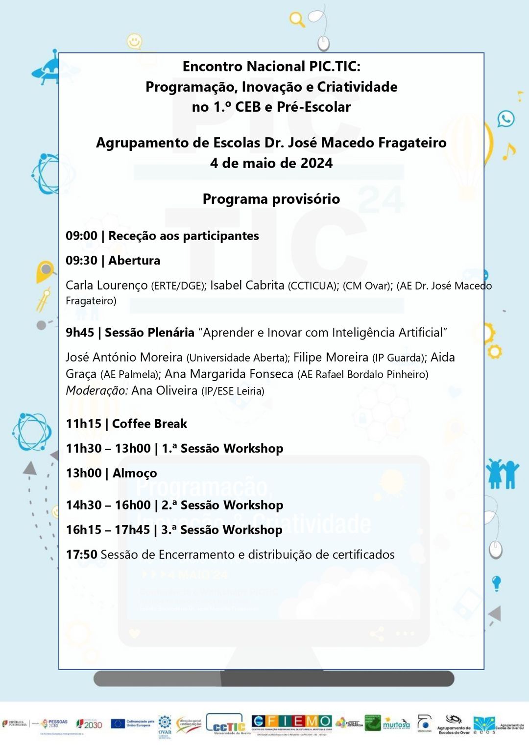Decorreu na Cidade de Ovar, na Escola Dr. José Macedo Fragateiro, no dia 4 de maio de 2024, a sétima edição do Encontro Nacional PIC.TIC (Programação, Inovação e Criatividade no 1.º ciclo do Ensino Básico).