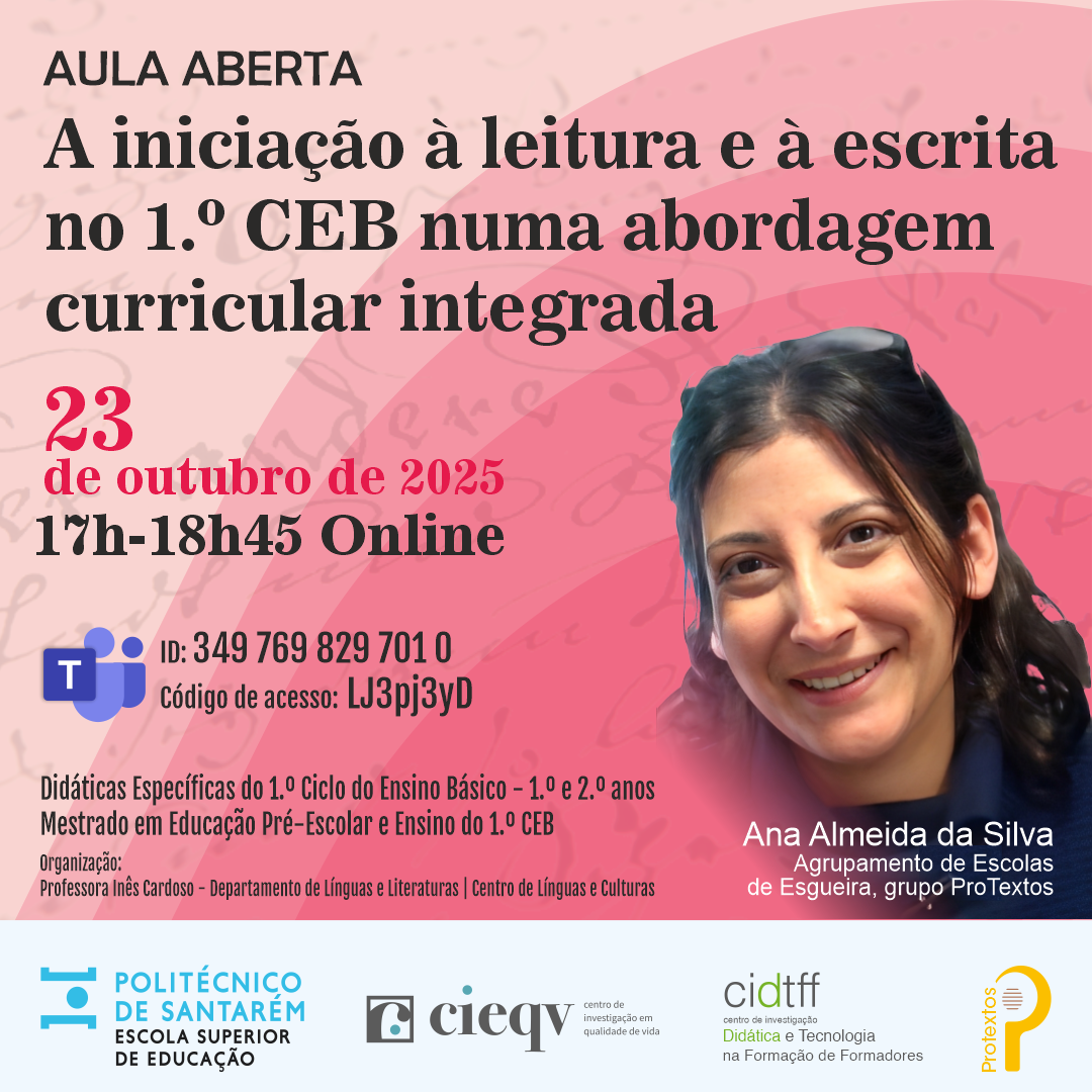 Intitulada “A iniciação à leitura e à escrita no 1.º CEB numa abordagem curricular integrada”, integra a aula de Didáticas Específicas do 1.º Ciclo do Ensino Básico – 1.º e 2.º anos – do Mestrado em Educação Pré-Escolar e Ensino do 1.º CEB do Instituto Politécnico de Santarém.