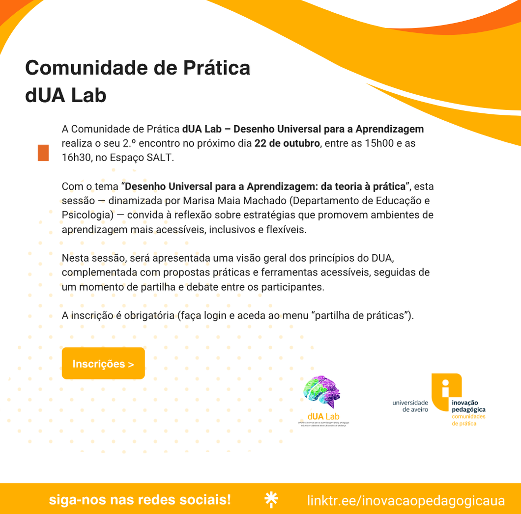 A Comunidade de Prática dUA Lab – Desenho Universal para a Aprendizagem, dinamizada por Marisa Maia Machado (CIDTFF, DEP, UA), realiza o seu 2.° encontro no dia 22 de outubro, entre as 15h00 e as 16h30, na sala SALT.