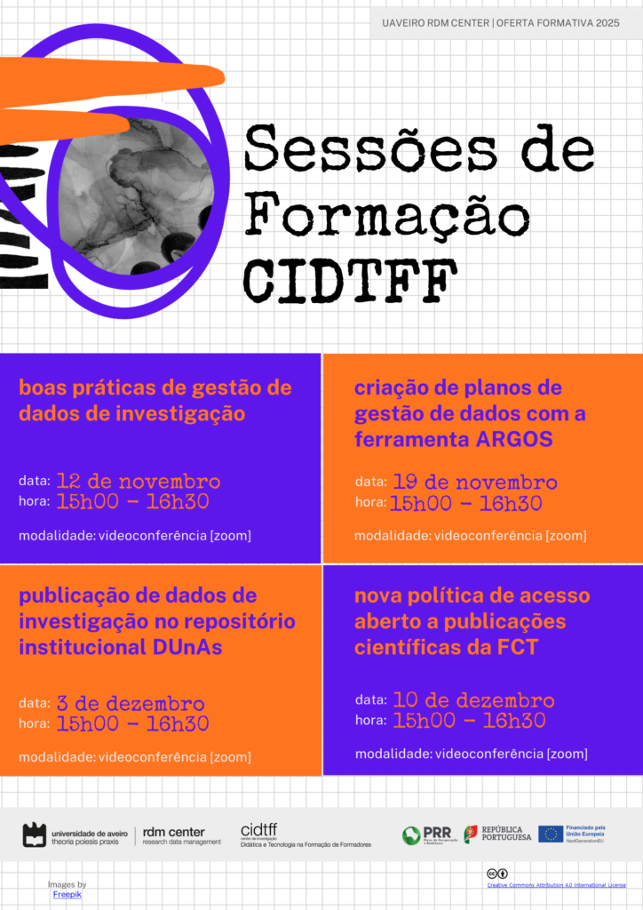Entre novembro e dezembro de 2025, o CIDTFF acolherá um conjunto de sessões de formação sobre ciência aberta e gestão de dados de investigação dinamizadas pela equipa do recém-criado UAveiro RDM Center – Centro de Competências para a Gestão de Dados de Investigação, afeto aos Serviços de Biblioteca, Informação Documental e Museologia (SBIDM) da Universidade de Aveiro.