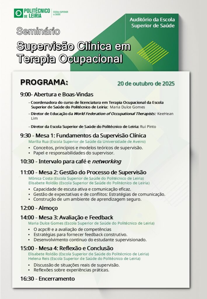 A investigadora Marília Rua (CIDTFF, ESSUA) participou no Seminário “Supervisão Clínica em Terapia Ocupacional” que teve lugar na Escola Superior de Saúde do Instituto Politécnico de Leiria (IP Leiria ESS), no dia 20 de outubro de 2025.
