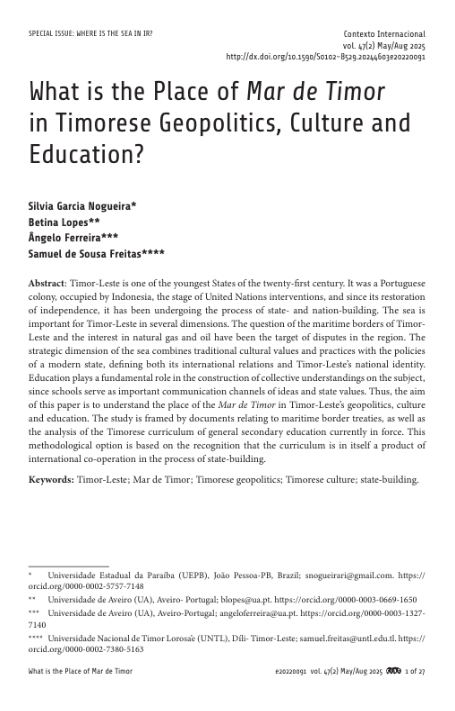 Referência: Nogueira, S. N., Lopes, B., Ferreira, Â., & de Sousa Freitas, S. (2025). What is the Place of Mar de Timor in Timorese Geopolitics, Culture and Education? Contexto Internacional – Journal of Global Connections, 47(2). http://dx.doi.org/10.1590/S0102-8529.20244603e20220091