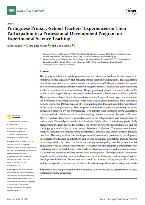 Referência: Saúde, I., Araújo, J. L., & Morais, C. (2025). Portuguese Primary-School Teachers’ Experiences on Their Participation in a Professional Development Program on Experimental Science Teaching. Education Sciences, 15(10), 1352. https://doi.org/10.3390/educsci15101352