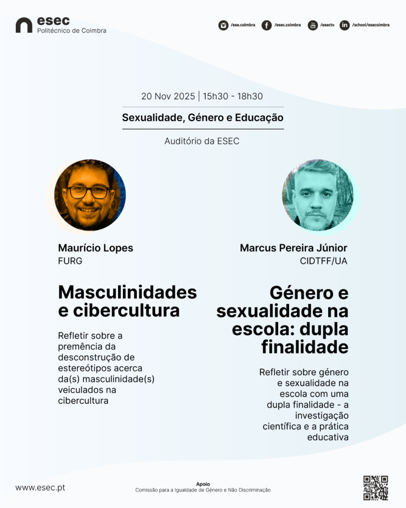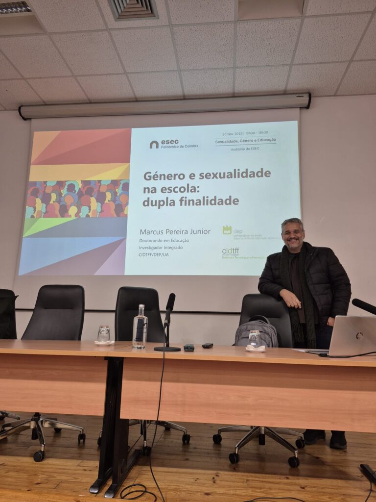 Organizado por Filomena Teixeira (colaboradora do CIDTFF e Professora Coordenadora da ESEC), o evento contou com duas palestras, uma das quais pelo estudante do Programa Doutoral em Educação do DEP/UA e membro do CIDTFF, Marcus Pereira Junior, intitulada “Género e sexualidade na escola: dupla finalidade”.
