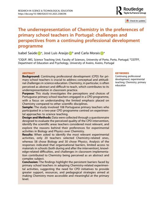 Referência: Saúde, I., Araújo, J. L., & Morais, C. (2025). The underrepresentation of Chemistry in the preferences of primary school teachers in Portugal: challenges and perspectives from a continuing professional development programme. Research in Science & Technological Education. https://doi.org/10.1080/02635143.2025.2586596