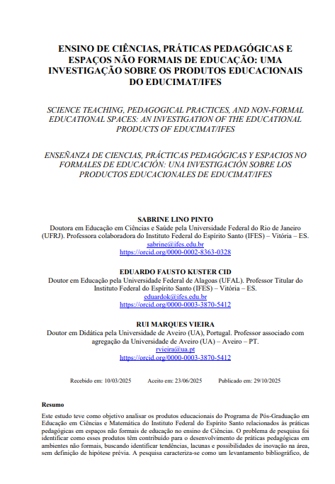 Lino Pinto, S., Fausto Kuster Cid, E., & Vieira, R. M. (2025). Ensino de Ciências, práticas pedagógicas e espaços não formais de educação: : uma investigação sobre os produtos educacionais do EDUCIMAT/IFES. Revista Brasileira De Pós-Graduação, 20(41), 1–25. https://doi.org/10.21713/rbpg.v20i41.2432