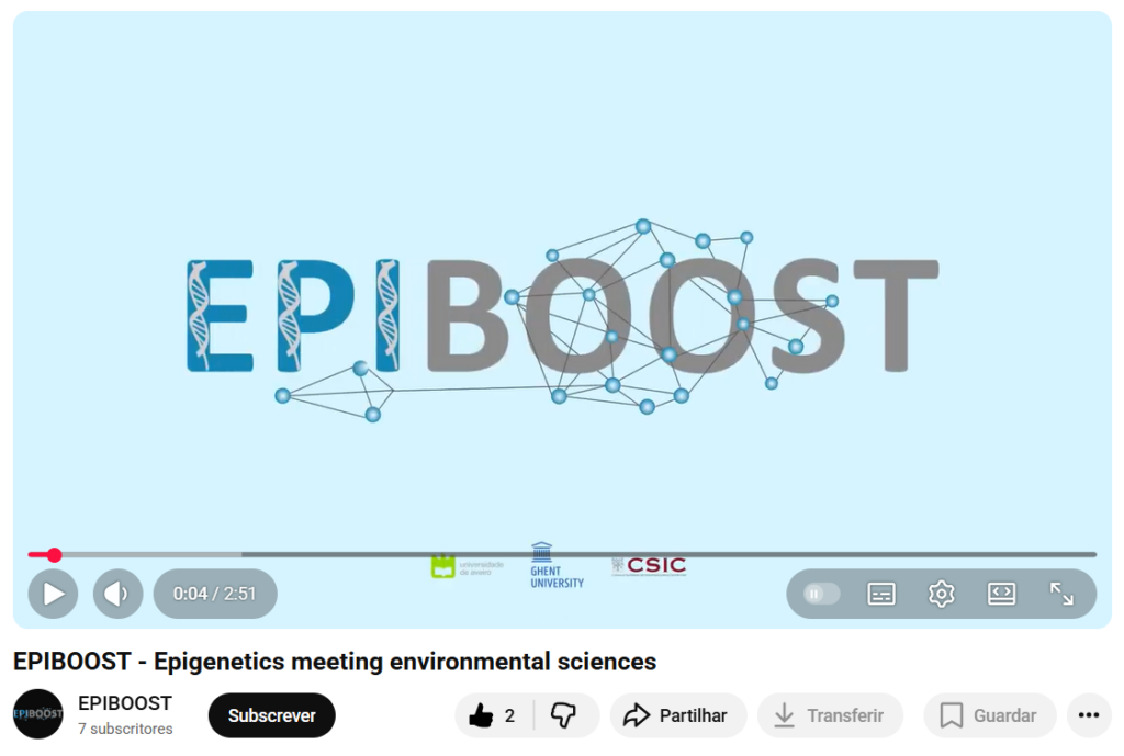 Produzido por Cecília Guerra (FCUP/CIDTFF), Maria José Loureiro (ccTIC UA/CIDTFF) e David Oliveira (DeCA/DigiMedia), o vídeo explora a relação entre epigenética e ciências ambientais, explicando o potencial papel da epigenética nas respostas dos organismos aos desafios ambientais (por exemplo, poluição) e os principais passos da investigação para compreender esse papel. Está disponível no canal de YouTube do projeto e pode ser visto aqui. Está, ainda, disponível no Zenodo.