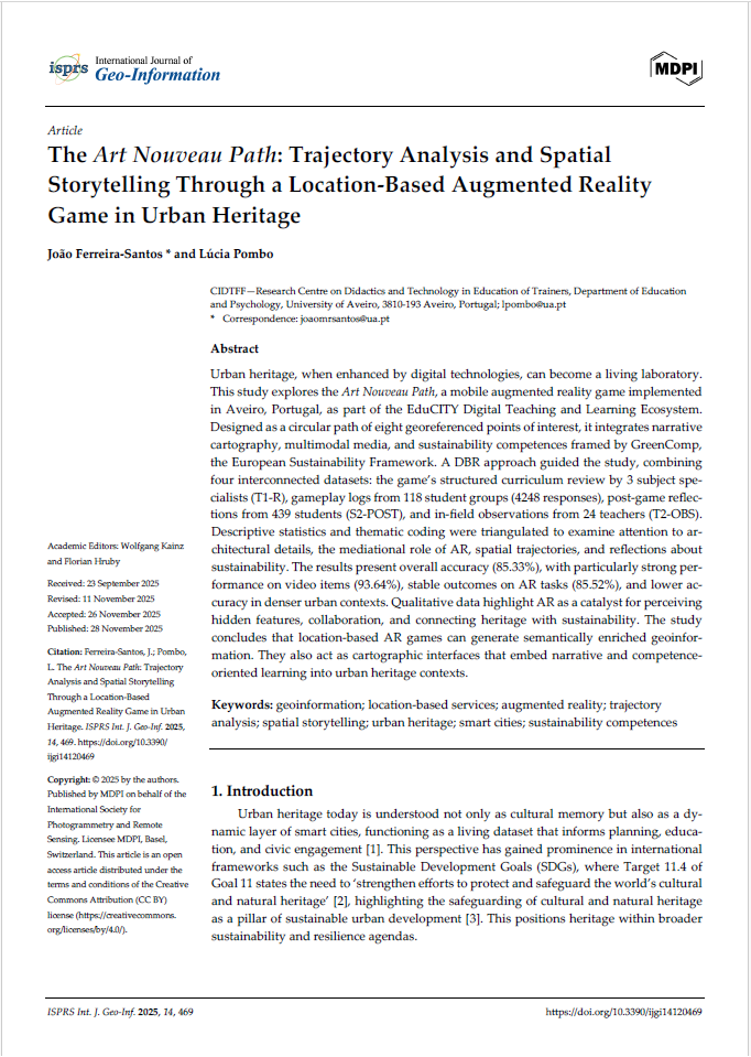 Referência: Ferreira-Santos, J., & Pombo, L. (2025). The Art Nouveau Path: Trajectory Analysis and Spatial Storytelling Through a Location-Based Augmented Reality Game in Urban Heritage. ISPRS International Journal of Geo-Information, 14(12), 469. https://doi.org/10.3390/ijgi14120469