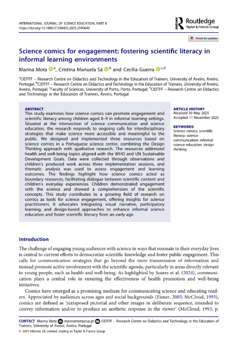 Mota, M., Sá, C. M., & Guerra, C. (2025). Science comics for engagement: fostering scientific literacy in informal learning environments. International Journal of Science Education, Part B, 1–23. https://doi.org/10.1080/21548455.2025.2590640